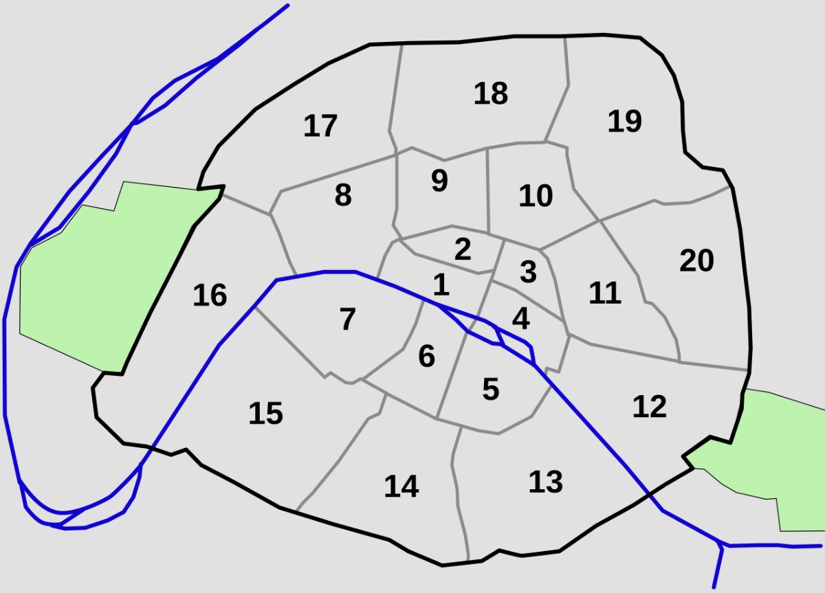 O 1º arrondissement fica no coração da cidade, onde está o Museu do Louvre. A partir daí, a espiral segue para o leste, depois para o sul, oeste e norte, até chegar ao 20º arrondissement, na periferia leste.