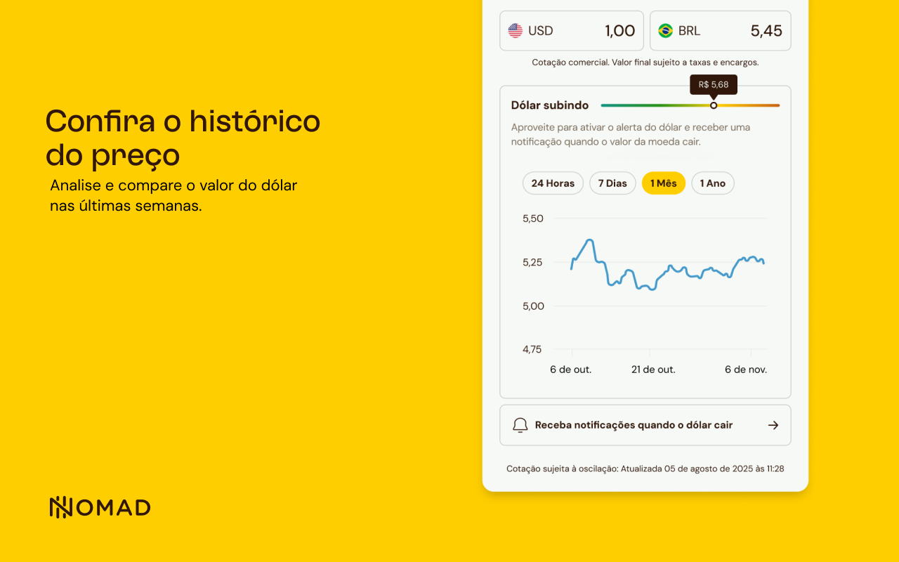 Saiba o valor exato do dólar comercial a qualquer momento. A extensão puxa os dados diretamente do sistema da Nomad, garantindo que a informação que você vê na tela do computador seja a mesma disponível no aplicativo para realizar suas conversões.