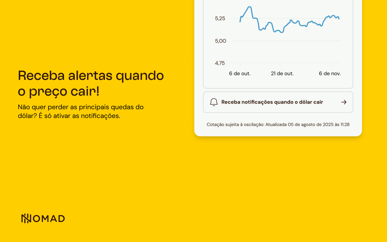 Se você já é cliente, instale a extensão agora mesmo e potencialize sua estratégia de câmbio. Se ainda não é, essa é a hora de abrir sua conta internacional Nomad. Aproveite a cotação do dólar comercial, taxas transparentes e uma vida financeira global sem fronteiras.