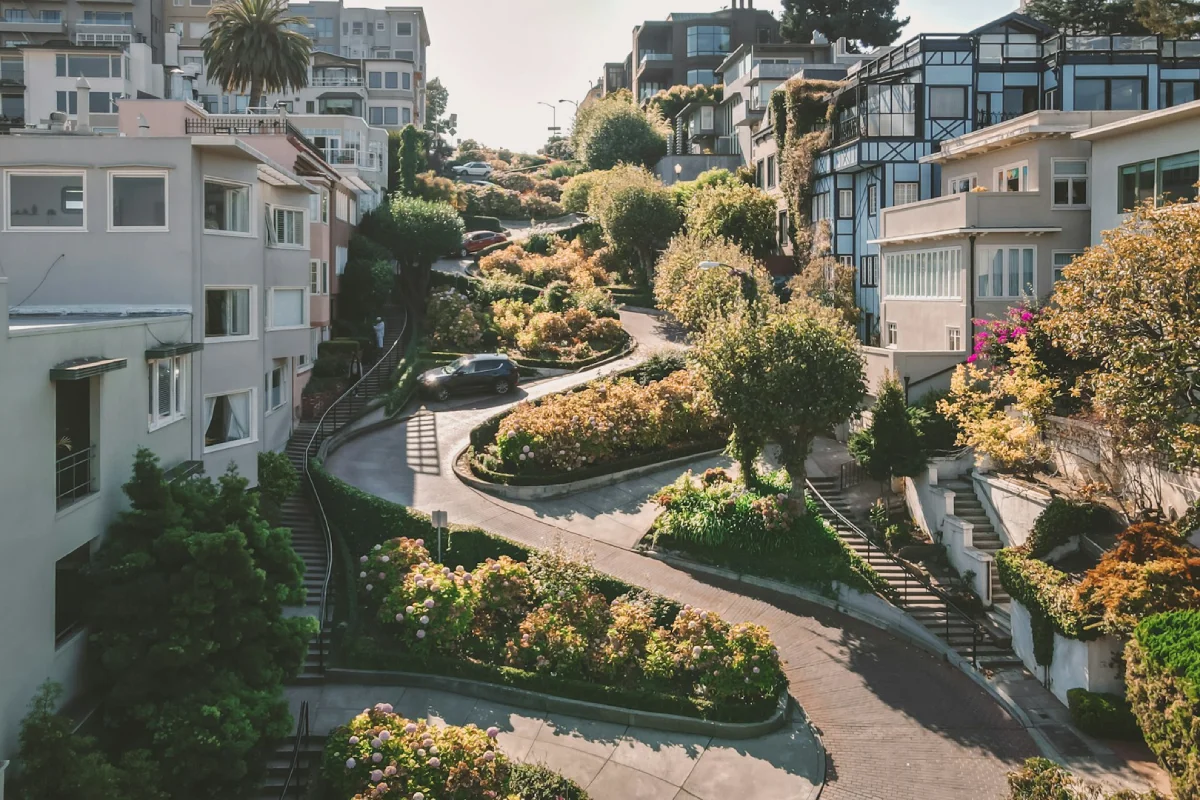 Conhecida como a "rua mais torta do mundo", a Lombard Street é famosa por seu trecho íngreme com oito curvas fechadas em zigue-zague, cercadas por belos jardins. Descer a rua de carro é um desafio divertido (prepare-se para a fila), mas caminhar pelas escadarias laterais também garante ótimas fotos.