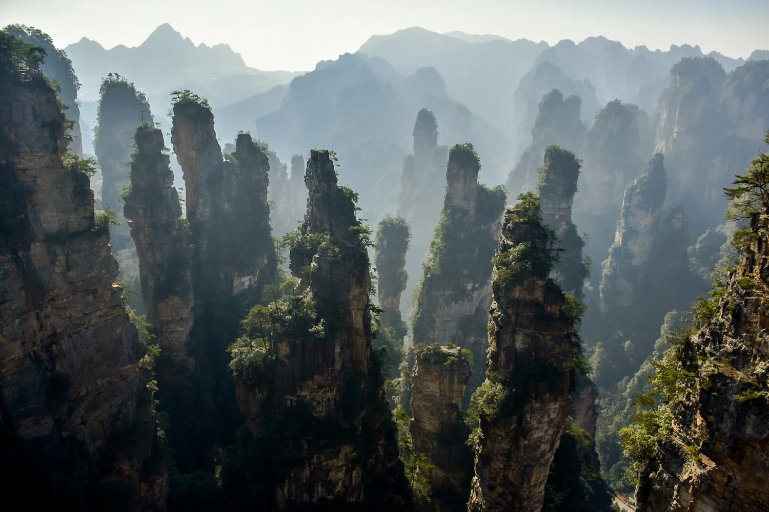 Você provavelmente já viu fotos de pilares gigantescos de pedra cercados por névoa. Essas são as montanhas do Parque Nacional de Zhangjiajie, que serviram de inspiração para as "Montanhas Aleluia" do filme Avatar. Pilares de arenito que se erguem por centenas de metros, cobertos de vegetação. Quando as nuvens baixam, as montanhas parecem flutuar.