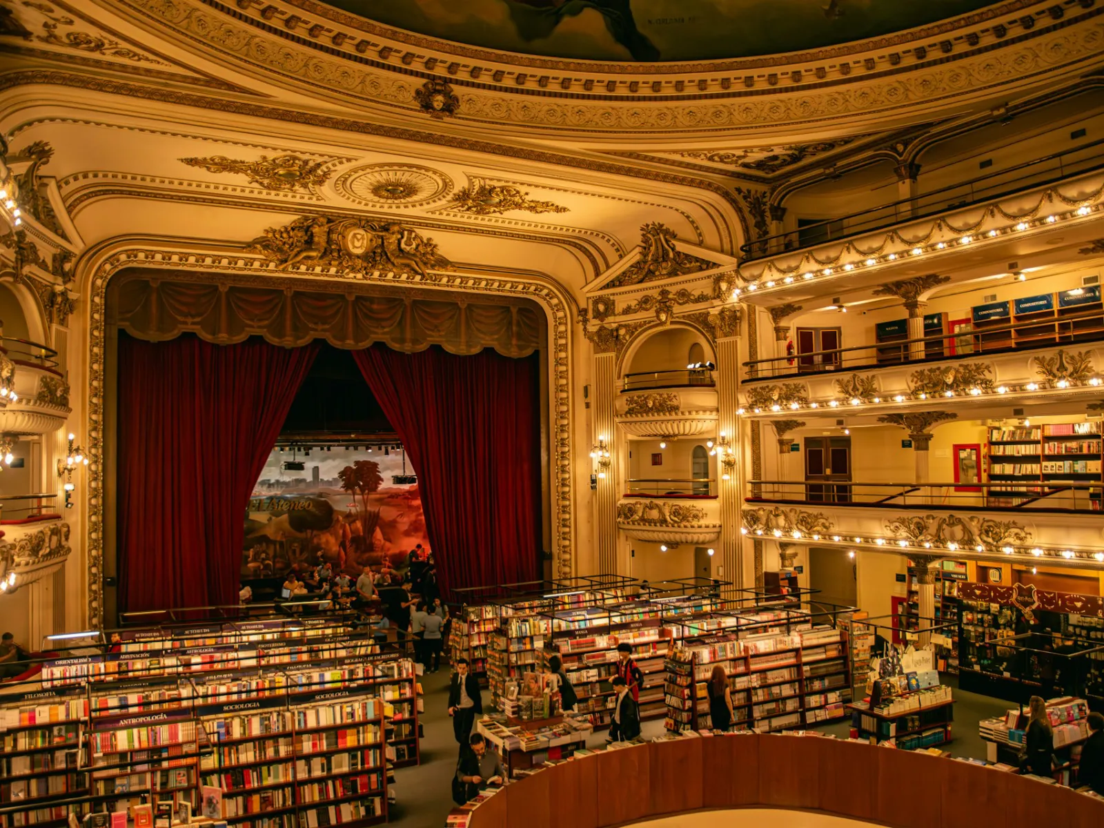 As estantes de livros ocupam a plateia e os camarotes, enquanto o palco, com suas cortinas de veludo vermelho originais, foi transformado em um café. É o local ideal para comprar um livro de autores argentinos e tomar um café sentindo a atmosfera literária da cidade.