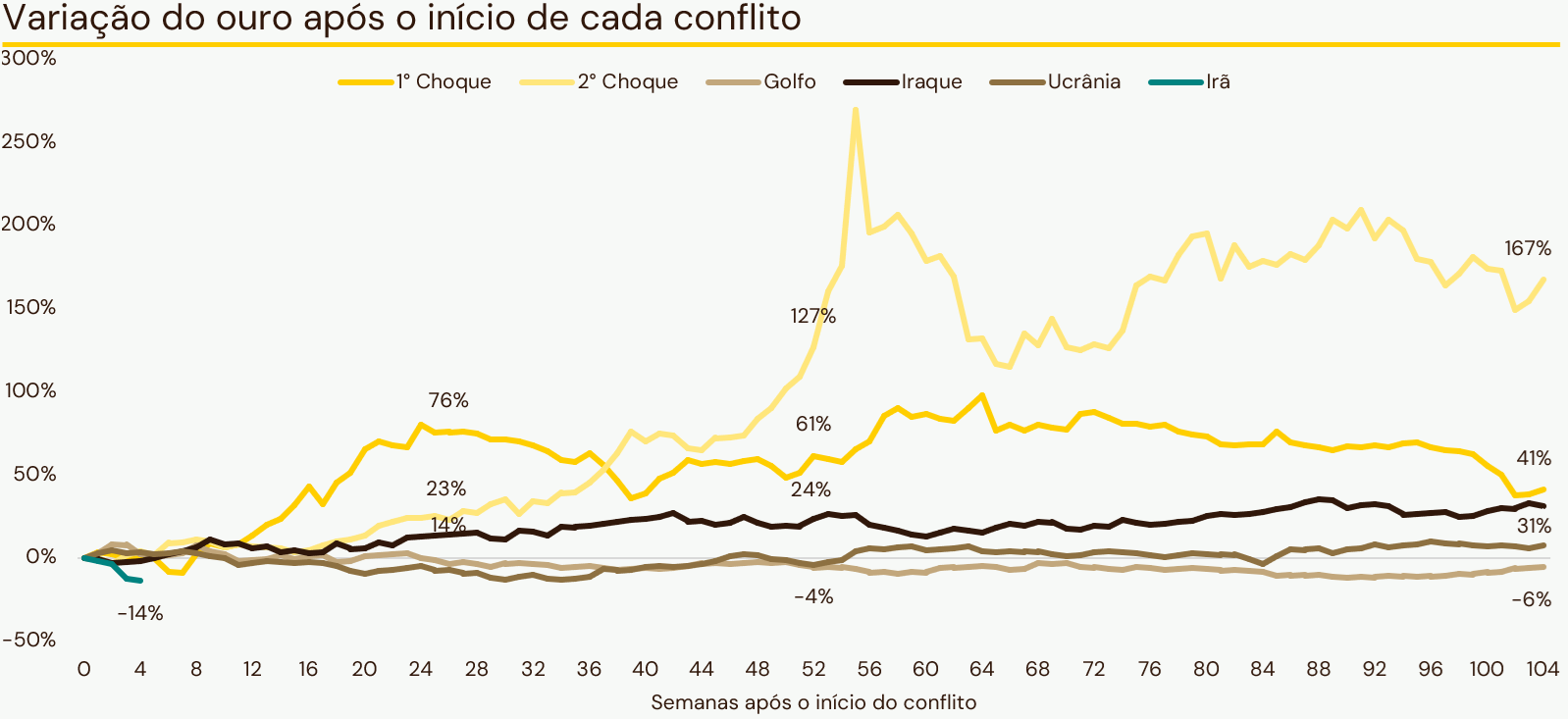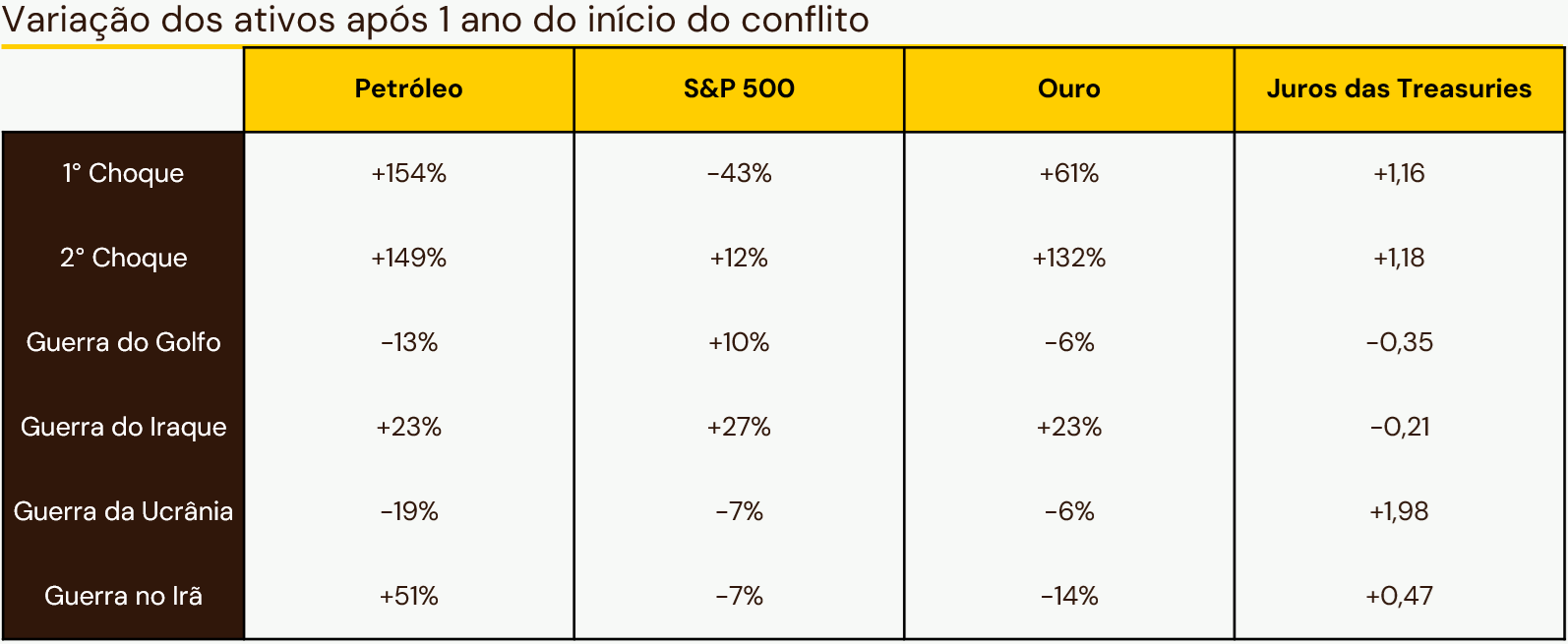 Olhar para conflitos anteriores e como os principais ativos se comportaram é interessante para percebermos padrões, mas é essencial perceber que cada conflito possui suas particularidades, como contexto, momento histórico, local e participantes, todos eles influenciando no comportamento dos ativos. O 1° e 2° choques do petróleo nos anos 1970, por exemplo, ocorreram em um momento em que a participação da OPEP na produção mundial era muito maior e o mundo dependia mais do petróleo, já que as fontes renováveis não haviam ganhado expressão.