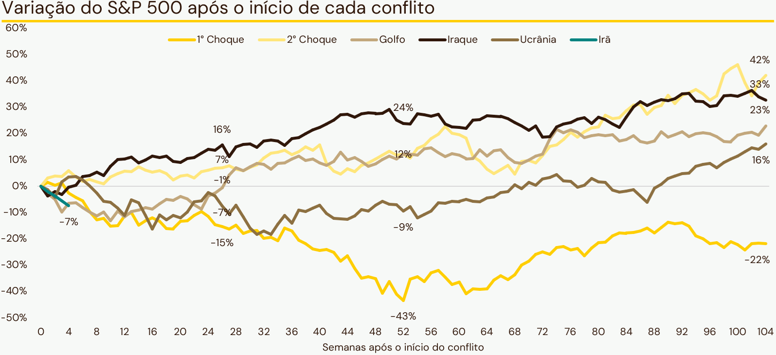 - Mesmo com o S&P 500 em geral sofrendo nos primeiros 6 meses dos conflitos, é notável a resiliência do índice, que, com exceção do 1° Choque, viu sua cotação subir em todos os outros cenários, com o pânico inicial se traduzindo em bons momentos de compra a longo prazo;