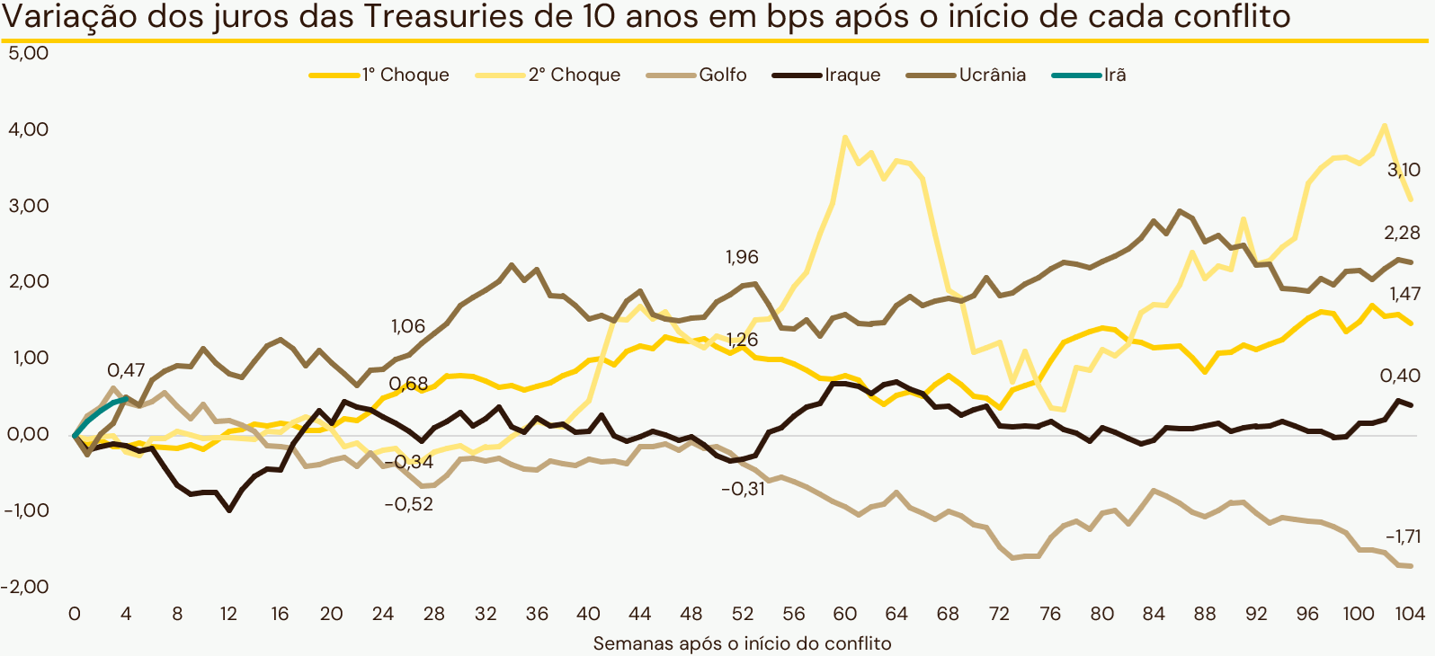 - Os juros das Treasuries americanas costumam responder rapidamente aos temores de pressões inflacionárias, mas a sua manutenção em patamares elevados depende da duração do choque de oferta do petróleo. Conflitos como a Guerra do Golfo, de curtíssima duração e pouco impacto na oferta, tiveram um impacto a curto prazo na elevação dos juros longos, mas que se dissipou em poucos meses.