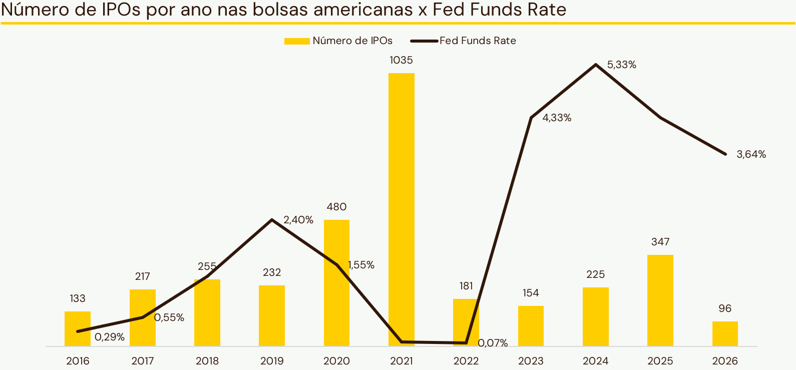 Historicamente, a quantidade e o volume das ofertas públicas serviram como um termômetro para o otimismo do mercado e para o surgimento de novos gigantes setoriais. Embora a taxa de juros tenha influência direta no momento em que as companhias decidem abrir seu capital, é notável como o mercado de IPOs nos EUA é muito forte. No Brasil, para efeito de comparação, não vemos um IPO desde 2021.
