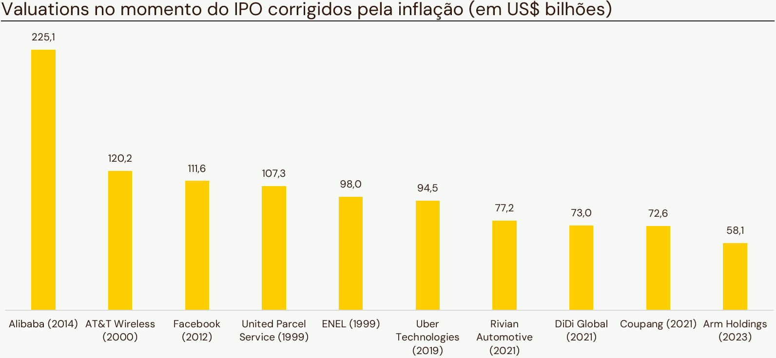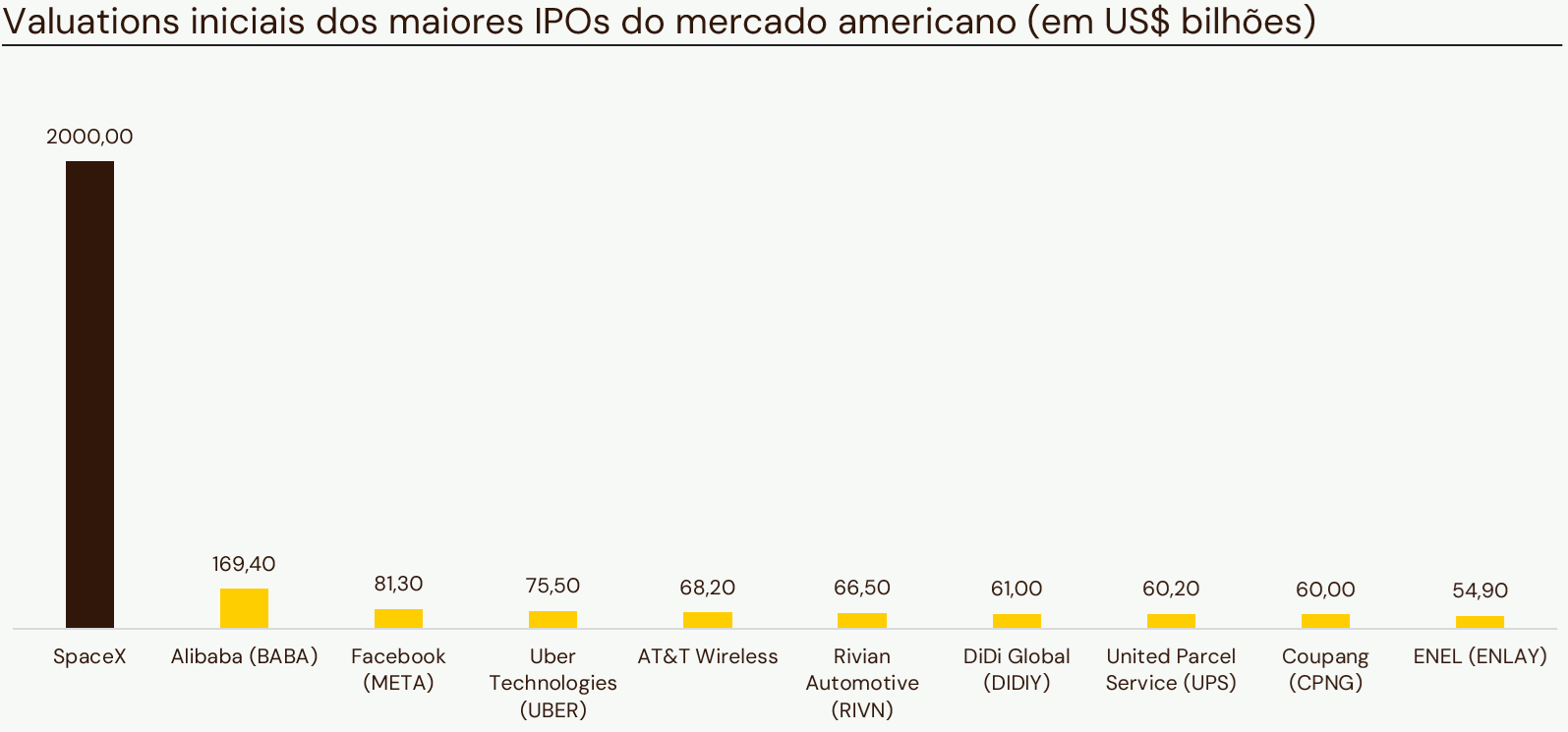 Quando analisamos os maiores IPOs americanos em valores nominais, a gigante chinesa Alibaba, que fez seu IPO em 2014 nos EUA, detém a coroa, com um valuation à época de US$ 169,40 bilhões. Logo atrás, aparecem nomes conhecidos como o Facebook (Meta), com US$ 81,30 bilhões, e a Uber, com US$ 75,50 bilhões.