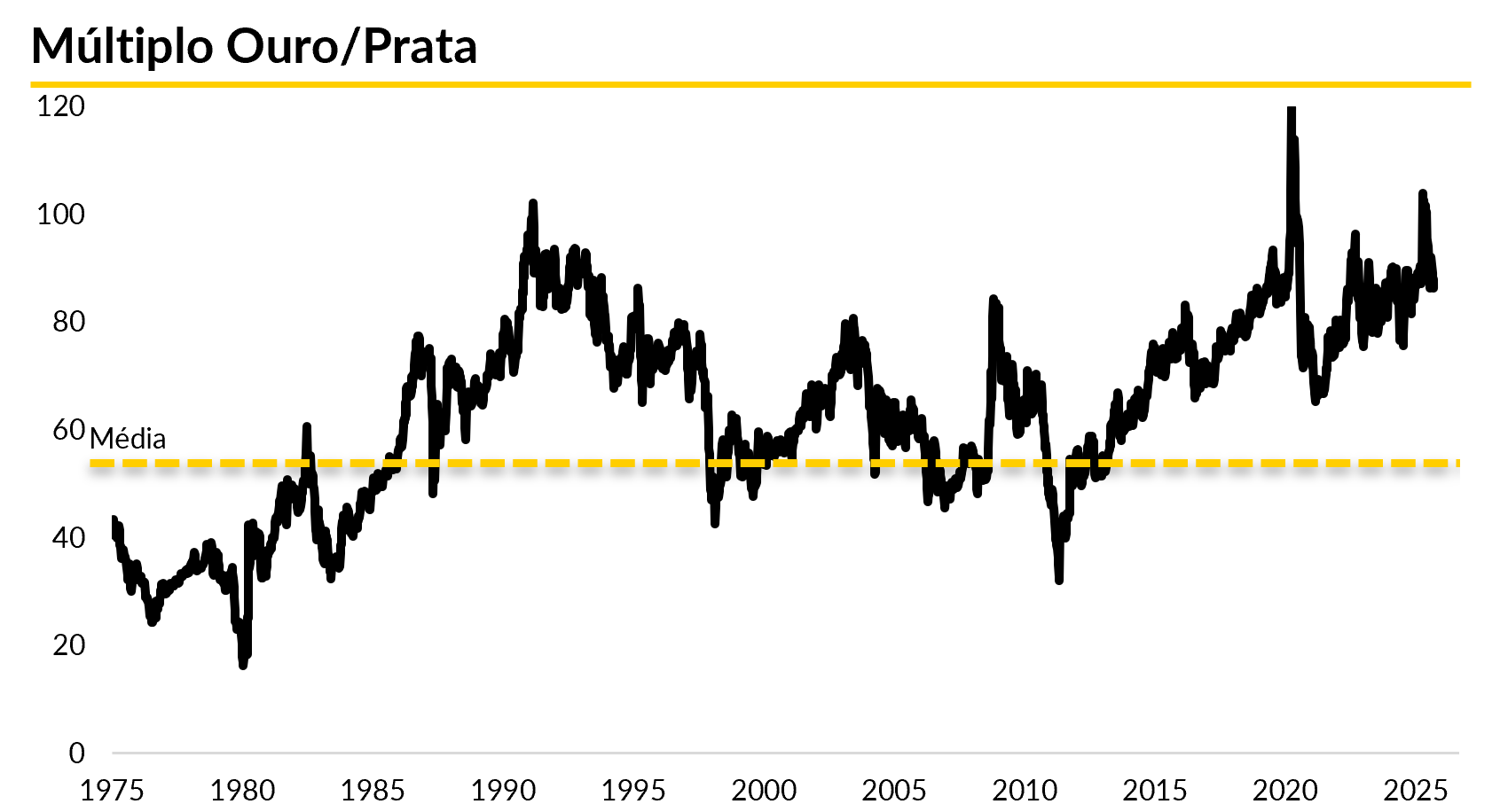 O múltiplo prata/ouro, que é literalmente a divisão do preço de uma onça de ouro por uma de prata, está distante da região de 100x, que normalmente antecede performances relativas superiores para a prata. Atualmente, o indicador está em 85x - acima da mediana de 65x (vide gráfico).