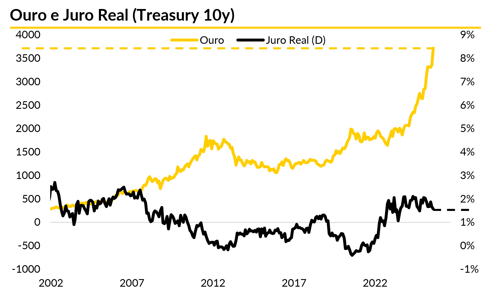 As Treasuries americanas são consideradas como ativos “livres de risco” e utilizadas em carteiras como proteção, por seu comportamento descorrelacionado com renda variável. Dado que o ouro é utilizado com propósitos semelhantes historicamente, quando as remunerações (o juro real) das Treasuries caem, há um maior incentivo para proteção em metais preciosos, por isso o indicador de juro real costuma apresentar correlação negativa com os preços da commodity, tendência que ainda se apresenta atualmente.