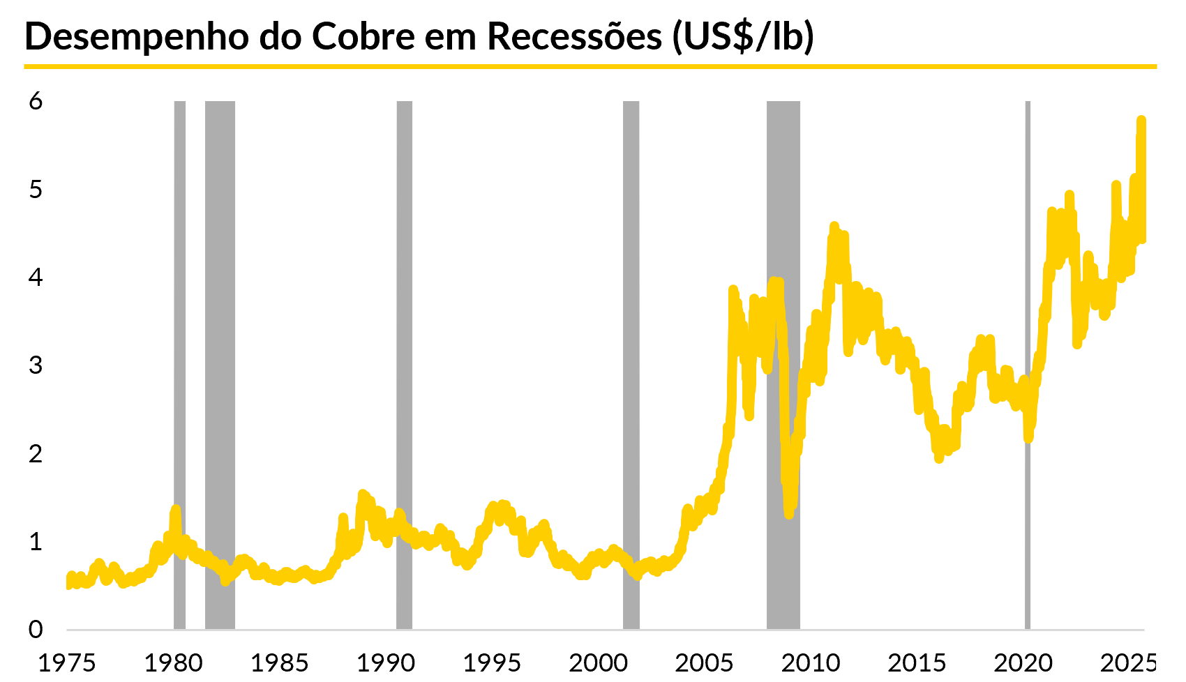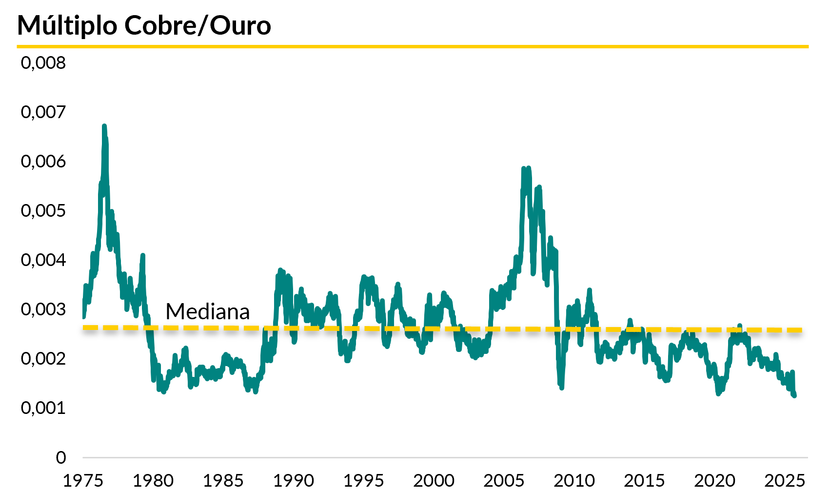 Ouro valorizando mais do que o Cobre: sinal clássico de aversão ao risco (risk-off), sugerindo preocupação com contração econômica, recessão ou instabilidade geopolítica. Muitas vezes precede ou coincide com desacelerações econômicas e dos mercados de risco