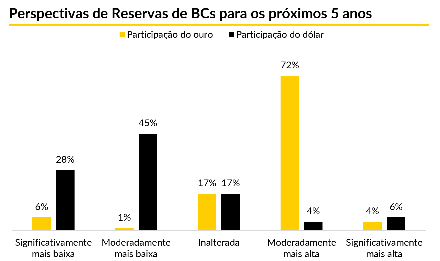 Acúmulo por Bancos Centrais: em um movimento intensificado após o início da guerra da Ucrânia motivar o congelamento de bens russos em dólar, o mundo vê uma corrida de bancos centrais por ouro visando a diminuição da exposição a dólares e títulos do tesouro americano (Treasuries). Esta tendência parece estar longe de acabar, com mais de 75% dos bancos centrais entrevistados pelo World Gold Council projetando aumento das reservas globais de ouro nos próximos 5 anos.