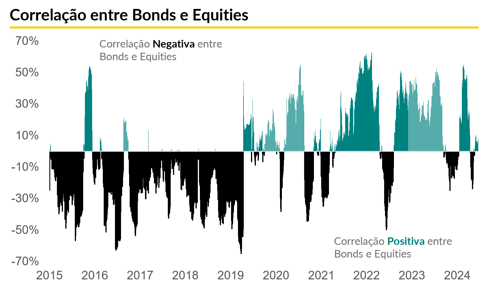 Descorrelação com a bolsa: desde a pandemia, Treasuries longas passaram a apresentar correlação positiva com renda variável, perdendo o status de hedge (proteção) natural contra a volatilidade da bolsa, como observado no gráfico. O ativo que vem ocupando esse papel é o ouro, cuja correlação diminuiu tanto com renda variável quanto fixa.