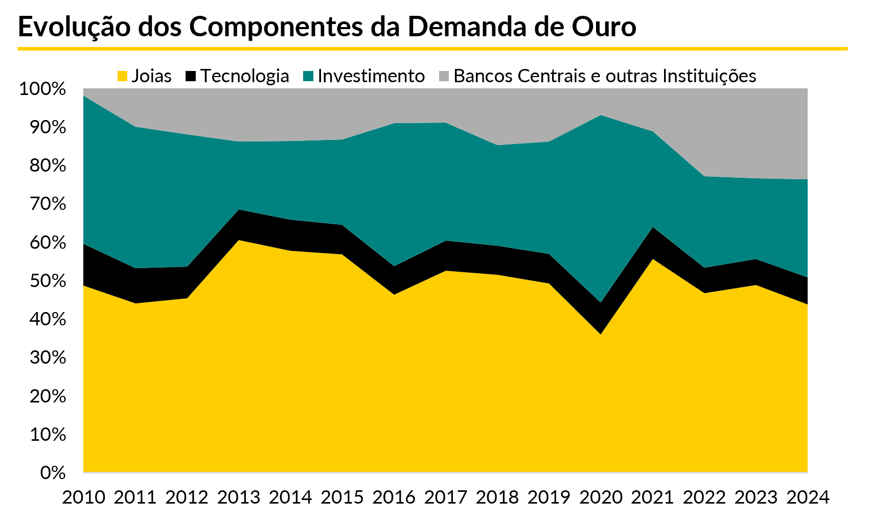 Investimento: a demanda para uso em barras e moedas, como meio de reserva de valor, ainda é relevante, correspondendo por cerca de 16% do total, embora venha perdendo participação.