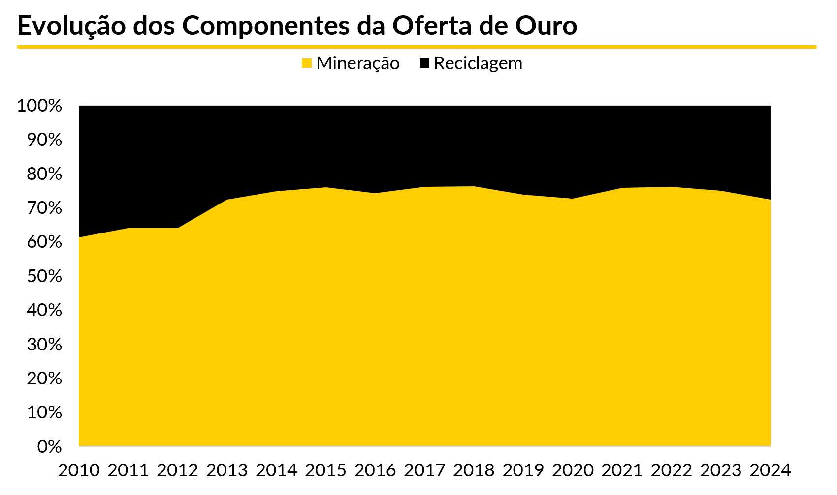 A oferta global de ouro é caracterizada por sua estabilidade e pelo papel significativo dos estoques acima do solo.