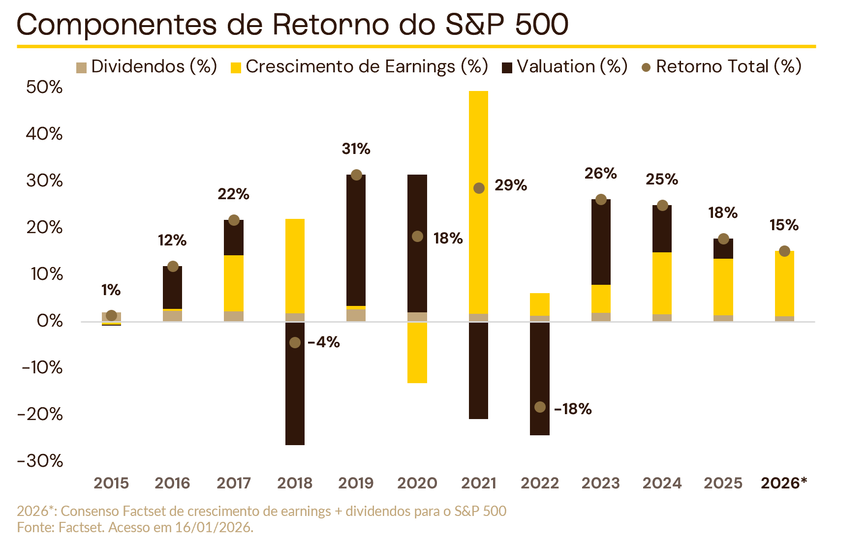 Para 2026, a projeção de crescimento de lucros aponta para um aumento de +14% nos números consolidados pelas empresas do S&P500 (estimativa FactSet - consenso e média surpresas nos últimos anos) e crescimento de +1% do dividend yield, que é a relação entre o dividendo pago e o preço da ação.