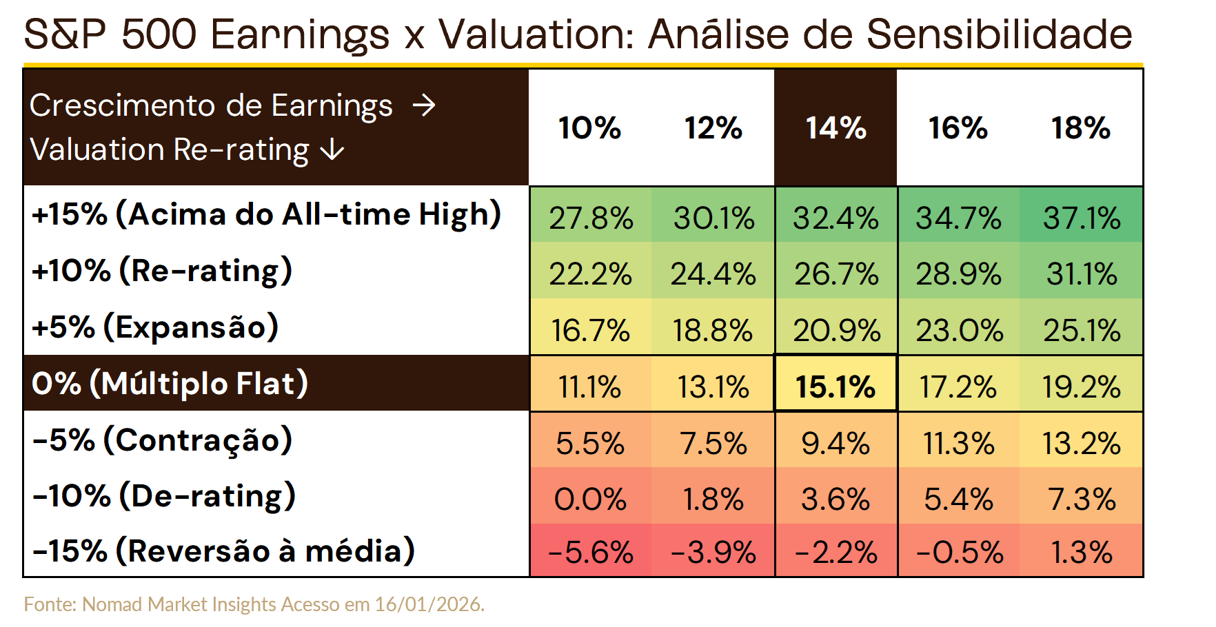 À luz desses conceitos, para que 2026 seja um ano positivo, o mercado não precisa necessariamente de uma expansão de múltiplos: ele precisa apenas que eles não caiam. Se o P/E permanecer estável em 22x, os investidores capturarão o retorno integral de 17%. Neste ambiente, a estabilidade do valuation é tão valiosa quanto o crescimento. Portanto, o foco em 2026 deve ser o cumprimento do guidance corporativo e, principalmente, as tendências para 2027, pois a sustentabilidade desse crescimento é o que impedirá a gravidade dos valuations de puxar os preços para baixo.