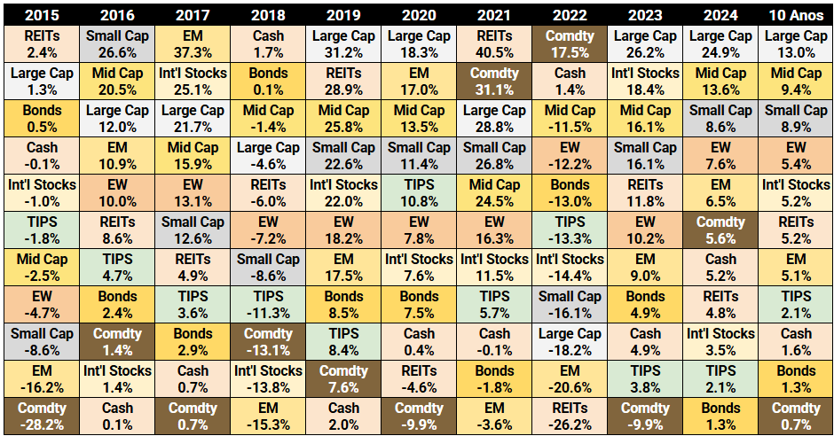 O popular “quilt chart”, que mostra a alternância constante de performance entre as classes de ativos a cada ano, é a prova visual disso. Perceba que a classe de maior valorização em um ano dificilmente também será a vencedora nos anos seguintes de forma recorrente. Essa troca entre posições demonstra o quanto é ineficaz tentar prever o "vencedor do ano".